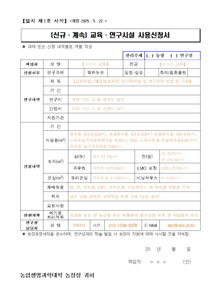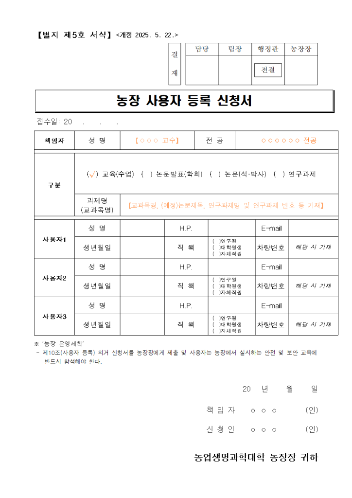 제7조 (사용신청 등) ① 교육·연구시설 사용을 희망하는 자는 별지 제1호 서식의 「교육·연구시설 사용신청서」에 다음 각호의 어느 하나에 해당하는 서류를 첨부하여 농장장에게 제출한다.