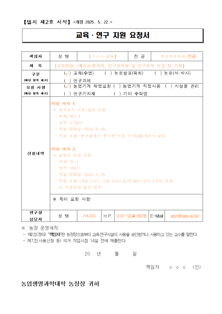 ② 제6조에 따라 교육·연구시설 사용을 승인받은 책임자는 연구의 기반조성을 위하여 농작업 등이 필요한 경우 별지 제2호 서식의 「교육·연구 작업요청서」를 지원 시작 희망일 14일 전에 제출한다.<개정 2025. 5. 22.>